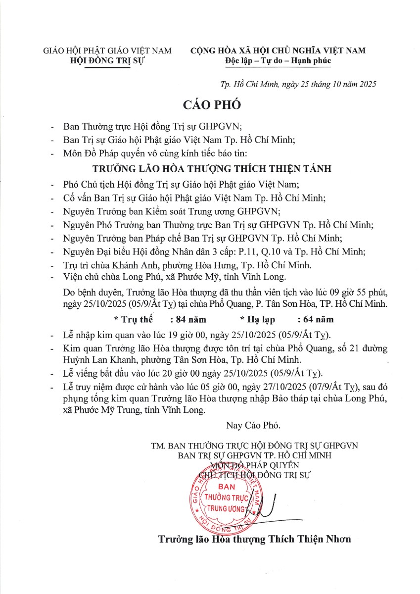 Cáo phó Trưởng lão HT.Thích Thiện Tánh viên tịch