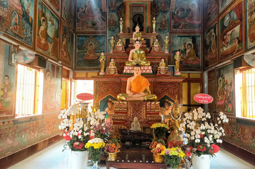 Để vào chính điện có bốn cửa ở bên hông. Lòng chính điện được thiết kế với trần cao, rộng và trang trí nổi bật với tranh tượng khác nhau. Vị trí trung tâm là bàn thờ Kim thân Đức Phật được bố cục thành năm cấp từ thấp đến cao, kích cỡ tượng tương ứng từ lớn đến nhỏ, mỗi cấp là một ban thờ Đức Phật ở những tư thế tu hành khác nhau, phản ánh sự kiện quan trọng trong cuộc đời Phật Thích Ca. Trên trần và vách chính điện là những bức tranh lớn, nhiều màu sắc, phác họa tiểu sử và cuộc đời Phật Thích Ca, từ lúc Hoàng hậu Maya nằm mơ thấy bạch tượng, rồi Ngài sinh ra Thái tử Tất Đạt Đa, đến khi Đức Phật thành đạo và nhập Niết bàn.