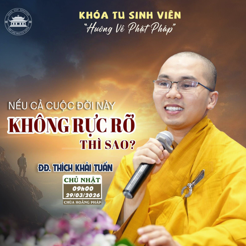9h00 - 10h30: Pháp Thoại: “NẾU CUỘC ĐỜI KHÔNG RỰC RỠ THÌ SAO?” được chia sẻ bởi Đại Đức Thích Khải Tuấn. Đã bao giờ bạn tự hỏi: Nếu mình chỉ là một đóa hoa dại ven đường, hay một ánh nến dịu dàng trong đêm, liệu có sao không?