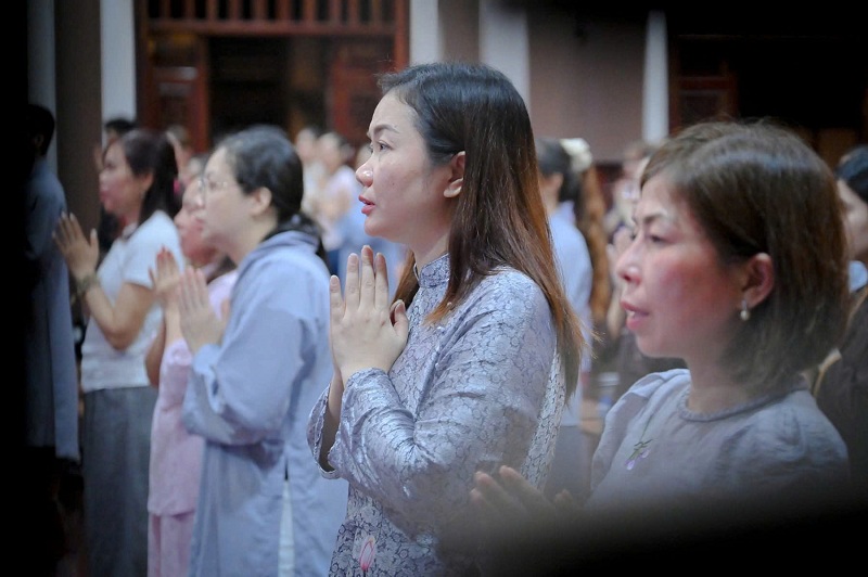 18h45, tại Pháp đường Chánh Niệm, buổi lễ bắt đầu trong không khí nghiêm tịnh. Đại chúng đồng dâng hương, đảnh lễ Tam Bảo và trang nghiêm trì tụng kinh Sức Mạnh Quan Âm.