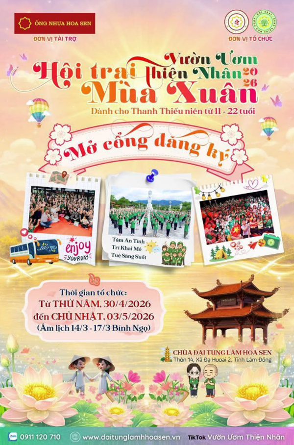 Tiếp nối hành trình vun trồng & nuôi dưỡng những mầm thiện, Hội trại mùa xuân 2026 – Vườn Ươm Thiện Nhân chính thức trở lại. Đây là mùa Vườn Ươm Thiện Nhân lần thứ 8 – đánh dấu hành trình đầy ý nghĩa được viết nên từ những bước chân an lạc và trái tim nồng hậu của biết bao con người dưới mái già lam Đại Tùng Lâm Hoa Sen.