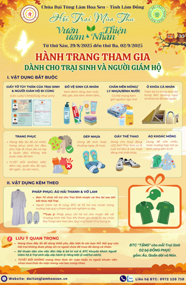 Chương trình hoàn toàn MIỄN PHÍ. Ban Tổ chức có hỗ trợ xe đưa - đón các em trại sinh, người giám hộ đi cùng, di chuyển từ 183 Nguyễn Văn Trỗi, P.Phú Nhuận, TP.HCM (Văn phòng Tập đoàn Hoa Sen) đến Đại tùng lâm Hoa Sen và ngược lại. Ngoài ra, Ban Tổ chức còn tặng cho các em 2 bộ đồng phục gồm: áo, quần thể thao và nón.