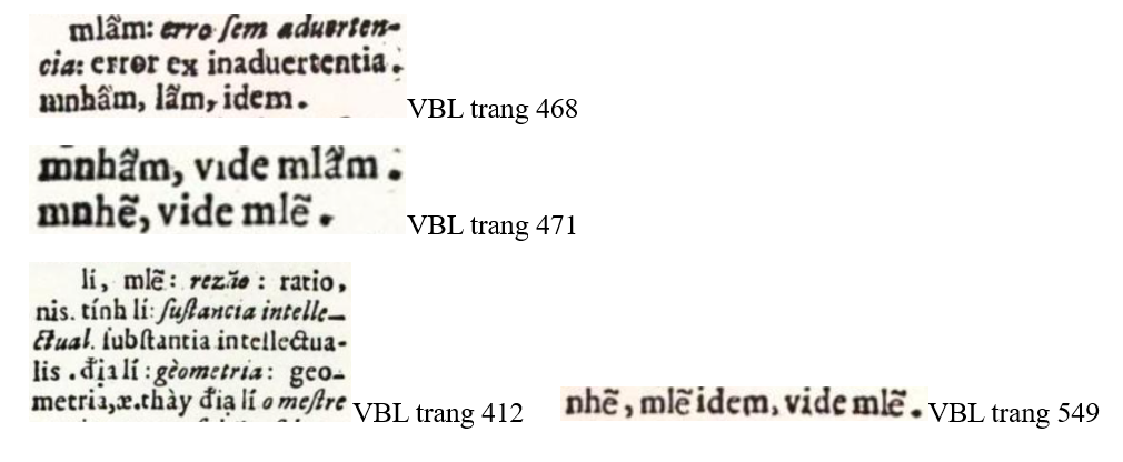 Ngoài ra VBL cũng ghi lại 15 trường hợp ml-, trong đó có 6 trường hợp dùng tương đương với l- như mlớn - lớn (không thấy ghi dạng nhớn), mlở - lở (không thấy ghi dạng nhở). Như vậy là trong 18 từ có phụ âm đầu ml- thì có 3 trường hợp dùng nh- (mnh-) hay là khoảng 3/18 ~ 17%, so với tiếng Việt cận đại (giọng Bắc nhời ~ lời, nhài ~ lài, nhạc ~ lạc ngựa …) thì khuynh hướng l > nh chiếm khoảng 8/18 ~ 44% (dựa vào 18 từ được ghi trong VBL). Điều này cho thấy khuynh hướng lẫn lộn l - nh đã tăng hơn (gấp) hai lần trong khoảng 4 TK. Khuynh hướng này có liên hệ gì đến lẫn lộn n - l hay không? Tại sao lạt và nhạt dùng tương đương, nhưng nạt lại mang nghĩa khác hơn so với lạt? So sánh các cách dùng lẹ làng, nhẹ nhàng nhưng lại không thấy *nẹ *nàng? Đây là một chủ đề rất thú vị, cần tra cứu sâu thêm và không nằm trong phạm vi bài viết này.