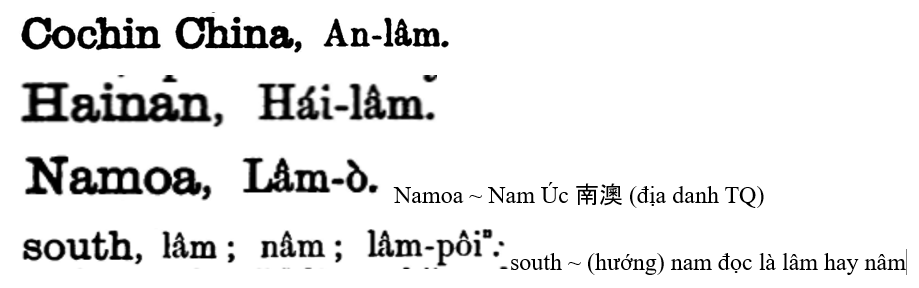 Nam cũng đọc là lâm theo giọng Phúc Kiến (Chương Thâu/Tuyền Châu ~ chincheos theo VBL), An Nam (Cochichina) đọc là An lâm - hình sau trích từ “Chinese-English Dictionary Of The Vernacular Or Spoken Language Of Amoy: With The Principal Variations Of The Chang-chew And Chin-chew Dialects” Carstairs Douglas (sđd):