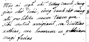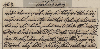 [v] Câu ca dao này có nét chữ đậm hơn nhưng cùng một kiểu viết, có thể là LM Béhaine đã ghi sau này: Taberd (1838) không gi câu ca dao này dù chép lại mục mặc 100% cũng như Theurel (1877). Chỉ có Theurel ở Đàng Ngoài ghi cách dùng ngã nhĩ so với hai tài liệu nguồn (Béhaine và Taberd).