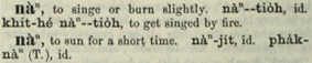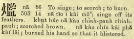 Trích từ trang 388 "A Pronouncing and Defining Dictionary of the Swatow Dialect arranged according to syllables and tones" (sđd). Để ý giọng Sán Đầu (Swatow < Triều Châu) đọc lạm/lãm/lam là nă với phụ âm phụ âm đầu l > n, rút gọn phụ âm cuối -m (không đọc). Sau 150 năm, người viết (NCT) vẫn còn thấy khuynh hướng rút gọn âm cuối như tam mùi (tam muội HV 三妹 ~ em thứ ba) thì đọc là sa mùi trong giọng Triều Châu ở Rạch Giá (Kiên Giang).