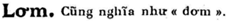 [vii] Dòm (nom) cũng có thể liên hệ đến động từ lâm/lậm 臨 đọc là 力尋切 lực tầm thiết (TVGT, ĐV, QV), 犂針切 lê châm thiết (TV, LT, VH), 犂沉切 lê trần thiết (CV) có nghĩa là nhìn hay xem từ ở trên cao xuống, một dạng âm cổ phục nguyên của lâm là *(b/p)lum (so với lom - nom) - dòm chữ Nôm thường dùng diệm/diễm 焰 mà âm cổ là *loms (so với lom - nom tiếng Việt). Dòm còn một dạng chữ Nôm khác dùng đạm 窞 (biến âm d - đ). Trích Đại Nhã 上帝臨女,無貳爾心 thượng đế lâm nữ, vô nhị nhĩ tâm (nữ ở đây chỉ đại từ danh xưng ngôi thứ hai - xem mục 1.5 nhĩ - mầy ở trong bài) - tạm dịch/NCT "ông trời dòm thấy hết các ngươi, đừng có nghi ngờ gì". Tương quan l - j/d còn thấy trong các cách dùng lâm 淋 dầm (dầm mưa), lâm 霖 dầm (mưa dầm) ...v.v...