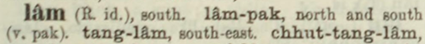 Trích từ trang 338 "A Pronouncing and Defining Dictionary of the Swatow Dialect arranged according to syllables and tones" (sđd). Tự điển William Duffus (sđd) cùng thời lại ghi hai cách đọc lam và nam.