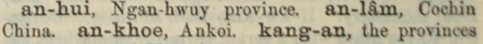 5. An Nam đọc thành An Lâm (giọng Sán Đầu 汕頭 Swatow - Triều Châu - một thành phố ven biển ở Quảng Đông), đảo Hải Nam (Hainan theo giọng BK) đọc là Hái-lâm - trích từ các trang 45, 130 trong cuốn English-Chinese of the Vernacular or Spoken language of Swatow - William Duffus, English Presbyterian Mission Press (1883).