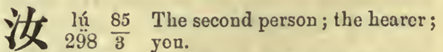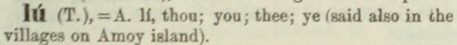 Tài liệu "A Pronouncing and Defining Dictionary of the Swatow Dialect arranged according to syllables and tones" (1883), soạn bởi giáo sĩ A. M. Filde (1839-1916), cũng cho thấy dạng lú 汝 là cách phát âm như/nhự HV 洳 (đại từ danh xưng ngôi thứ hai - Triều Châu, hay tên sông). Nhữ 汝 và nhĩ 爾 尔 đều có cùng một gốc Hán Tạng.
