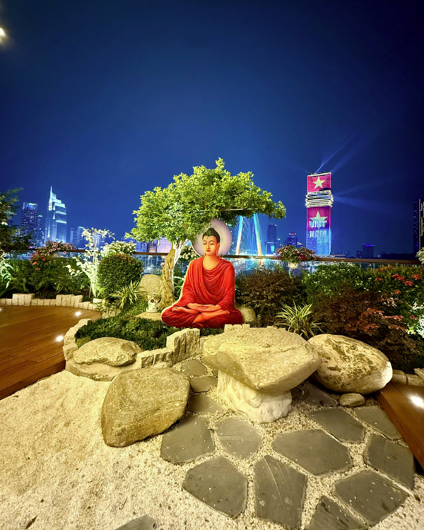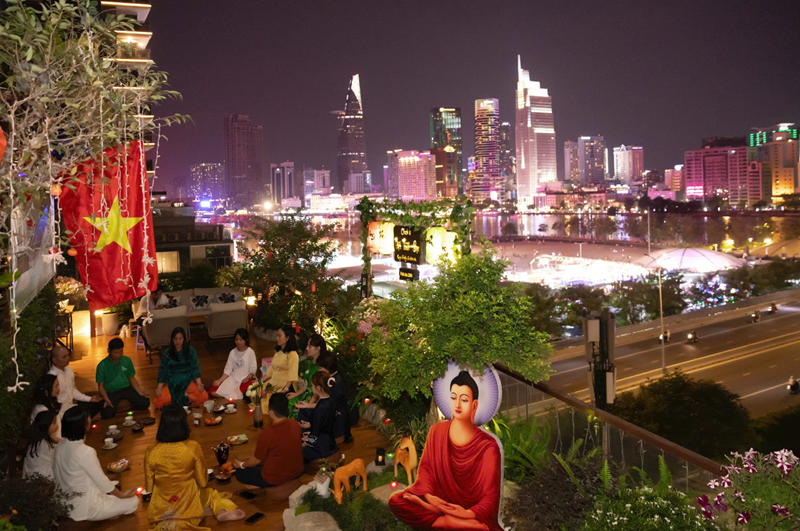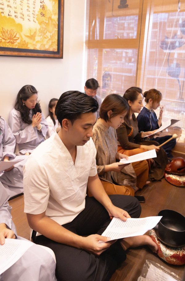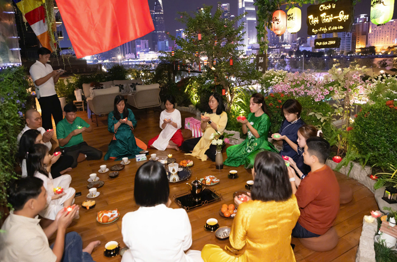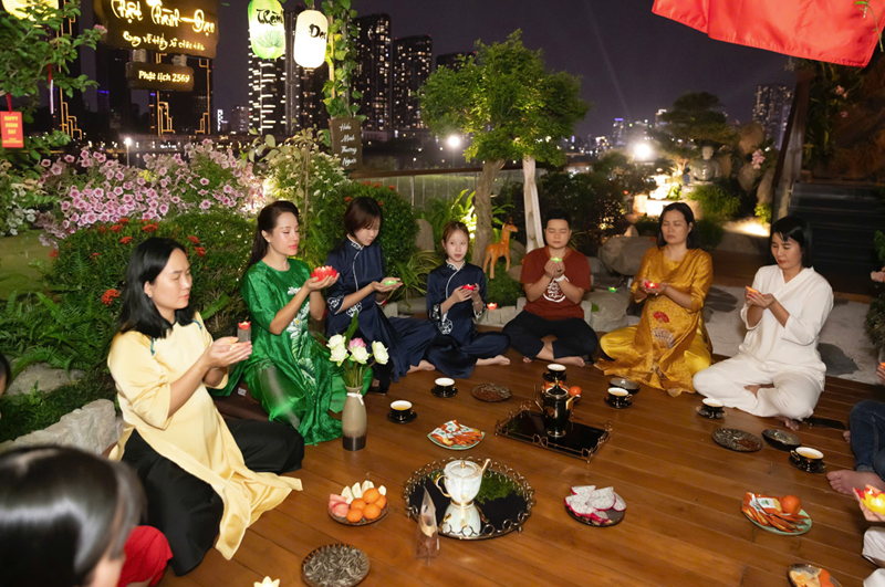 Ngoài phần tụng niệm và đọc thời kinh, buổi lễ còn có không gian trà đạo - một hoạt động mang tính tĩnh lặng, giúp người tham dự an trú tâm, lắng nghe và trao đổi về tu tập. Những cuộc trao đổi, chia sẻ Phật pháp giữa các đạo hữu và khách mời diễn ra một cách thân mật, hướng về tinh thần hoan hỷ, hoà hợp và ứng dụng lời Phật dạy trong đời sống gia đình, công việc.