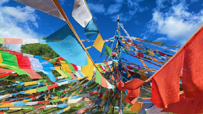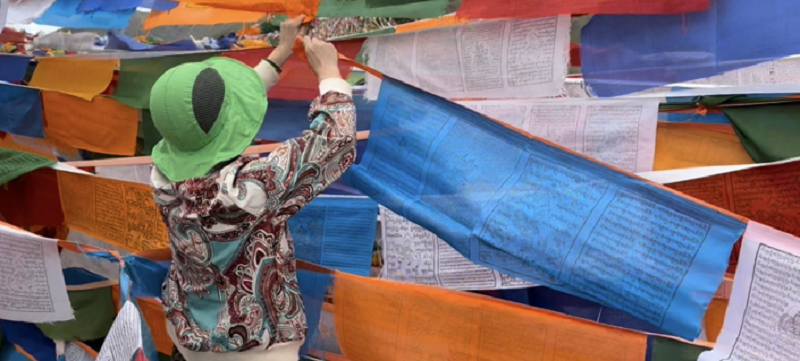Nhưng khoảnh khắc độc đáo nhất là vào Choe-Kyong Losar (Ngày 3), khi tôi cùng một nhóm bạn người Tạng lên một ngọn đồi gần đền thờ Dzambala treo cờ nguyện mới. Hàng ngàn lá cờ phong mã, năm màu tượng trưng cho ngũ đại (đất, nước, lửa, gió, không), được tháo dỡ và thay thế.