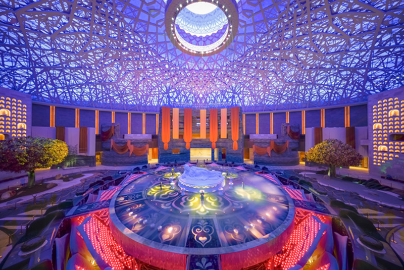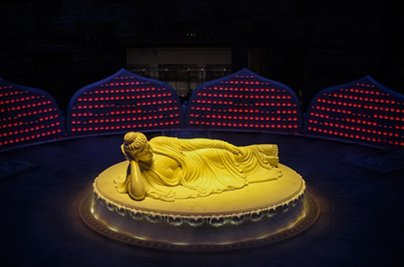 - Trần của Địa Cung: Lấy cảm hứng từ những cành cây sala nơi đức Phật nhập niết bàn. Sử dụng phim và ánh sáng trong suốt hoàn toàn, trần nhà tạo ra bốn khung cảnh riêng biệt theo thời gian: ánh sáng ban mai, ánh nắng giữa trưa, ánh sáng hoàng hôn và đêm trăng. Đây là một trải nghiệm thị giác huyền ảo và đầy cảm xúc, khiến du khách cảm thấy như đang hòa mình vào dòng chảy của thời gian và không gian, từ bất ngờ này đến bất ngờ khác. Sự kết hợp giữa công nghệ và nghệ thuật đã tạo nên một không gian thiêng liêng, nơi ánh sáng và bóng tối kể lại câu chuyện về sự vô thường và giác ngộ.