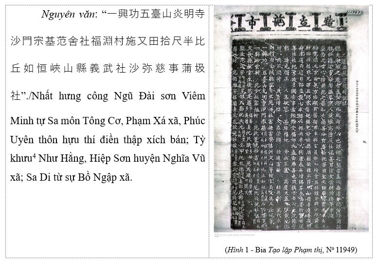 (Dịch nghĩa: Hưng công có các vị sa môn[5] Tông Cơ chùa Viêm Minh núi Ngũ Đài, ở thôn Phúc Uyên, xã Phạm Xá hiến cúng 10 thước rưỡi ruộng; Tỳ khưu Như Hằng ở xã Nghĩa Vũ, huyện Thán Sơn và sa di Từ Sự ở xã Bồ Ngập cùng tham gia).