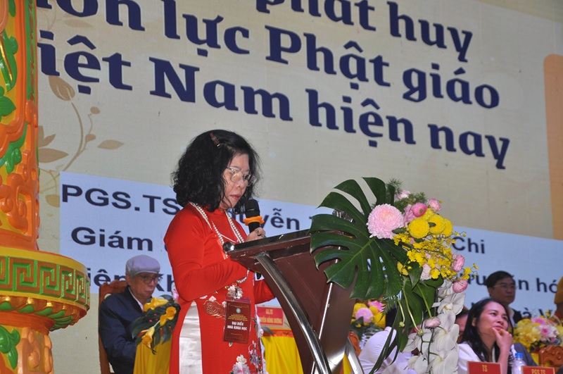 Tham luận vấn đề “Thực tiễn và cơ chế phối hợp phát huy nguồn lực tổng thể”: PGS.TS Nguyễn Thị Phương Chi đã phác thảo bức tranh tổng thể về thực tiễn nhập thế của Phật giáo từ đạo đức, an sinh đến kinh tế.