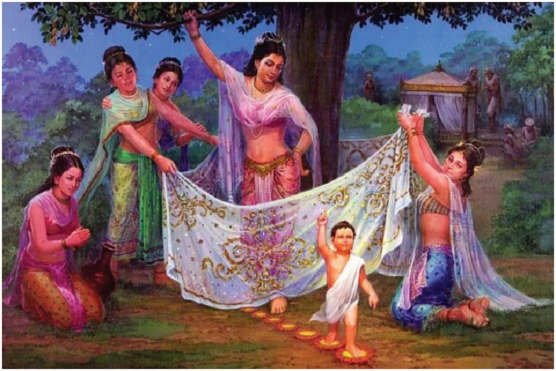 Trong một đêm nọ, hoàng hậu Māyā mộng thấy Voi trắng sáu ngà nhập vào hông bên phải, sau 10 tháng thọ thai, theo truyền thống, người phụ nữ mang thai đứa con đầu lòng phải trở về quê ngoại để sinh.