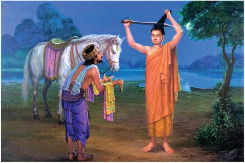 Khi tới bờ sông Anoma, Thái tử dừng lại, bỏ ngựa, cạo râu tóc, trao y phục và đồ trang sức cho Channa, lệnh cho Channa trở về. Còn một mình Ngài ra đi với bộ áo màu vàng đơn giản của người tu sĩ hướng tới lý tưởng cao cả: Tìm ra sự thật tối hậu, lý lẽ của sống và chết, ý nghĩa của nhân sinh, của cuộc đời, con đường dẫn tới giải thoát, cõi Niết-bàn bất tử.