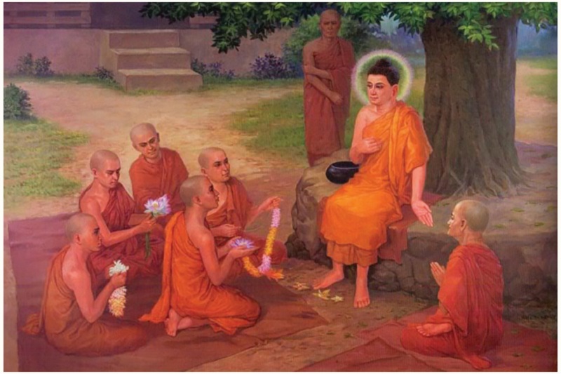 “Hỡi các Tỳ-kheo, Ta đã được giải thoát khỏi mọi ràng buộc thế gian và xuất thế gian. Các ngươi cũng vậy, hỡi các Tỳ-kheo, cũng đã được giải thoát khỏi mọi ràng buộc thế gian và xuất thế gian. Hãy đi! Hỡi các Tỳ-kheo, vì lợi lạc của số đông, vì hạnh phúc của số đông, vì lòng lân mẫn đối với thế gian, vì lợi lạc, vì hạnh phúc của loài Trời và loài người. Các người hãy đi, nhưng đừng đi hai người cùng một hướng. Hãy truyền bá đạo pháp, hỡi các Tỳ-kheo. Đạo pháp toàn thiện, ở phần đầu, phần giữa cũng như phần cuối, cả trong ý tứ và lời văn, hãy tuyên bố về cuộc sống Thánh, toàn thiện và thanh tịnh...”(14).