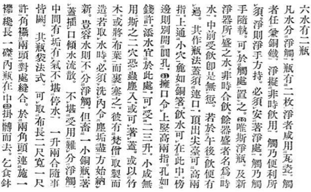 Phỏng dịch/NCT "Chương 6 - Hai loại bình đựng nước. Nước thường được phân thành hai loại: sạch (tịnh - để uống) và không sạch (xúc - để rửa), cho nên có hai loại bình chứa nước riêng biệt. Nước sạch thì đựng trong bình bằng sứ hay đất nung, còn nước rửa thì đựng trong bình bằng đồng hay sắt. Nước sạch dùng để uống lúc nào cần thiết, còn nước rửa dùng sau khi đi vệ sinh. Phải dùng tay sạch cho bình đựng nước sạch và đặt bình ở một chỗ sạch; dùng tay không cần sạch cho bình đựng nước rửa và đặt ở nơi không cần sạch. Nước trong bình sạch có thể uống bất kỳ lúc nào, nước ở trong các bình khác thì tùy thời gian đã quy định mà dùng. Uống nước trước hay trong giờ ngọ (từ 11:00 đến 13:00 giữa trưa) thì không sao, nhưng không được (phép) uống sau giờ ngọ. Nắp bình phải vừa với miệng (để dễ uống/NCT), phần trên nắp phải cao khoảng hai ‘chiều ngang ngón tay’ với một lỗ đủ lớn để cho một chiếc đũa đồng lọt qua: nước uống phải đựng trong loại bình như trên.