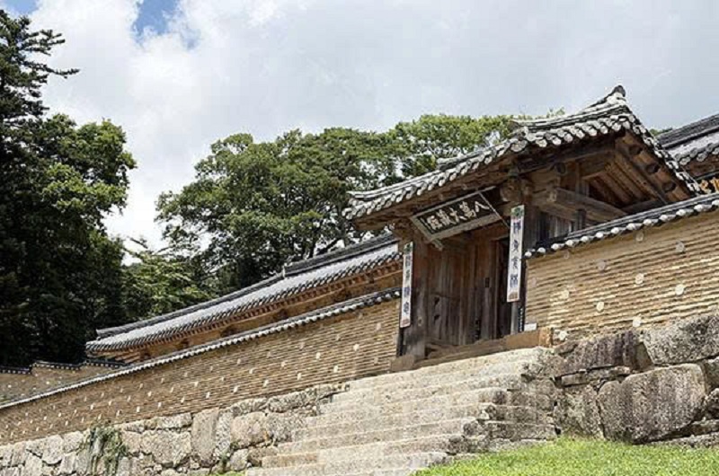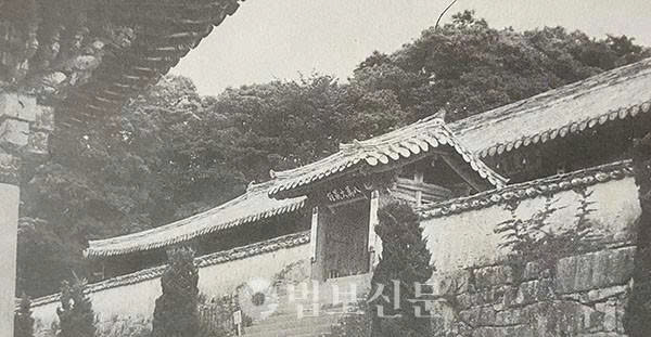 Trong ảnh, khi bạn leo lên những bậc đá dốc, bạn có thể nhìn thấy một cổng có mái hình chữ A với biển báo chính giữa ghi “BÁT VẠN ĐẠI TẠNG KINH” (팔만대장경, 八萬大藏經), được bao quanh bởi những bức tường dài ở cả hai bên và bên trong, chỉ có thể nhìn thấy mái của một tòa nhà dài.