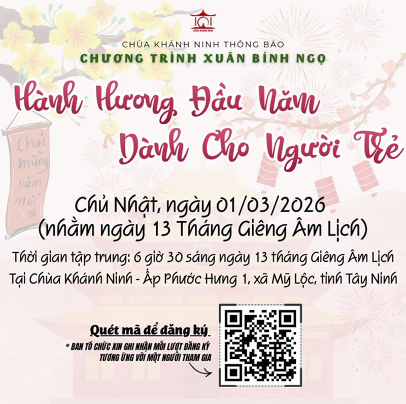 Chùa Khánh Ninh trân trọng tổ chức chương trình hành hương đầu năm dành cho người trẻ, với mong muốn gieo duyên lành trong những ngày đầu xuân, khởi đầu năm mới bằng tâm thanh tịnh và hướng thiện. Đây là cơ hội để các bạn trẻ quay về lắng nghe và chăm sóc nội tâm, hiểu và ứng dụng Phật pháp một cách gần gũi trong đời sống, kết nối những người trẻ cùng chí hướng, nuôi dưỡng tâm lành và bồi đắp đời sống tinh thần vững chãi giữa xã hội nhiều biến động.