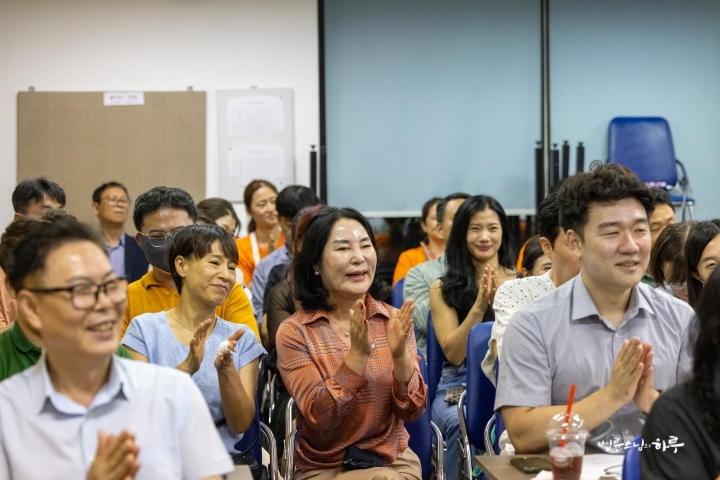 Sau buổi pháp thoại, Thiền sư Pomnyun Sunim chụp ảnh lưu niệm cùng các thiện nguyện viên đã chuẩn bị cho buổi giảng và bày tỏ lòng tri ân sâu sắc trước sự tận tâm của mọi người.