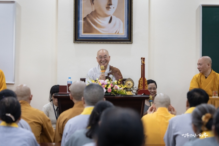 Trong phần giao lưu, Thiền sư Pomnyun Sunim nhận được nhiều câu hỏi từ chư tăng và phật tử Việt Nam, xoay quanh việc duy trì và phát triển Phật giáo trong bối cảnh xã hội hiện đại.