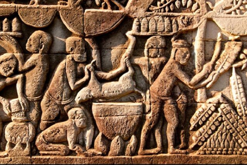 Khi thăm quần thể Angkor Wat (xây dựng vào khoảng TK 12) và Angkor Thom, người viết (NCT) cũng thấy vài hoa văn/phù điêu trên tường - ghi lại lịch sử, thần thoại của xã hội Khmer cổ - có những đoạn cho thấy hình đầu rau (lò dùng ba hòn gạch) khá phổ thông trong đời sống - xem hình chụp bên dưới (A). Có thể xem toàn thể hoa văn và phù điêu trên tường là một loại từ điển bách khoa 'không lời' so với từ điển VBL chẳng hạn. Chúng đều cho ta nhiều thông tin giá trị về đời sống xã hội vào thời trước.