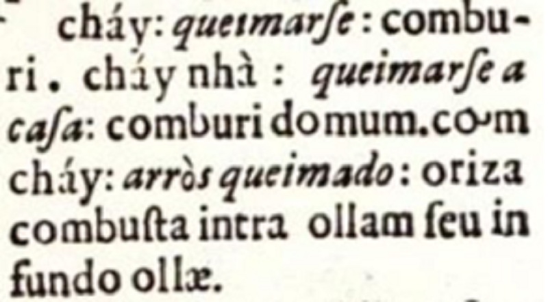 Phần tiếng Bồ Đào Nha chỉ đơn giản dịch trực tiếp cơm cháy là arròs queimado - xem hình chụp bên trên (D) - nhưng phần La Tinh giải thích chi tiết thêm là cơm bị cháy ở trong hay dưới đáy nồi. Một lần nữa cho thấy hai ý khác nhau, phản ánh hai soạn giả khác nhau hay LM de Rhodes/cộng sự đã cập nhật mục cơm cháy. Các nồi nấu điện hay gas hiện đại không bị áp lửa như đầu rau, nên không bị cơm cháy, cơm khê, cơm khét như ghi nhận trong VBL. Một điều thú vị là CNNAGN ghi các cách gọi của cơm cháy là tiêu 焦 phạn (cơm cháy) hay để 氐 phạn (cơm ở đáy/nền nồi).