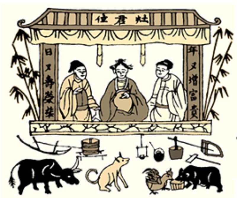[xiv] Tranh dân gian Đông Hồ cũng giống như tranh trích từ Oger: một ông (có râu) và hai bà (không có râu), tuy nhiên trên bàn thờ cúng cá chép, không vẽ con chó và câu đối đơn giản là niên tăng phú quý, nhật thọ vinh hoa.