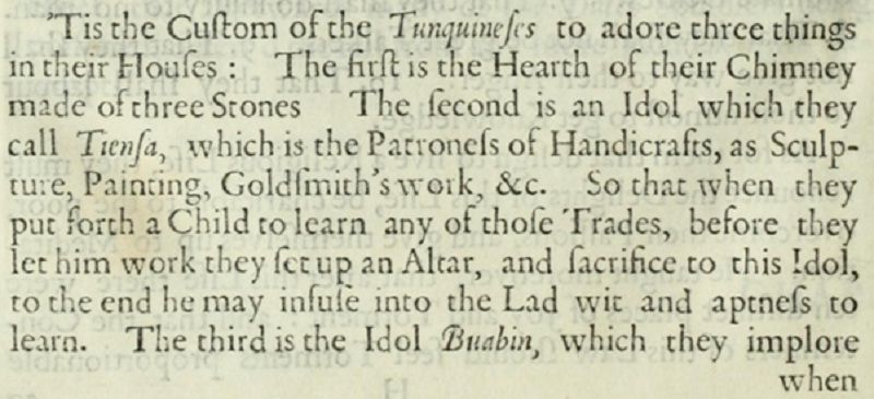 Tạm dịch/NCT: "Đây là phong tục người Đàng Ngoài: thờ ba vị thần trong nhà - thứ nhất là lò của ống khói làm bằng ba viên đá, thứ hai là Tiên Sư[ii] (Tiensa) người bảo hộ cho các nghề thủ công như nghề chạm khắc, nghề sơn, nghề làm vàng ...v.v... Thành ra, mỗi khi cho một đứa nhỏ học nghề nào như đã nói trên thì trước đó họ lập bàn thờ và dâng lễ vật để cúng vị thần (tổ sư/tiên sư/NCT) của nghề - với mục đích là vị tiên sư này sẽ giúp đứa nhỏ có đầu óc và năng khiếu học nghề đã chọn. Vị thần thứ ba là Buabin theo ghi chép của JB Tavernier (có thể là vua Biền - theo người viết/NCT dựa vào các mục vua[iii] và Tiết độ sứ Cao Biền/Cao Vương (trong lịch sử Việt Nam vào đời Đường) – (B) khi bắt đầu thiết kế xây nhà (họ dựng bàn thờ và mời các vị sư và sãi đến cúng)".