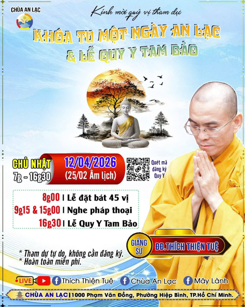 Thời gian khóa tu: 7g-16g30, chủ nhật, ngày 12/4/2026 (25/02/Bính Ngọ).