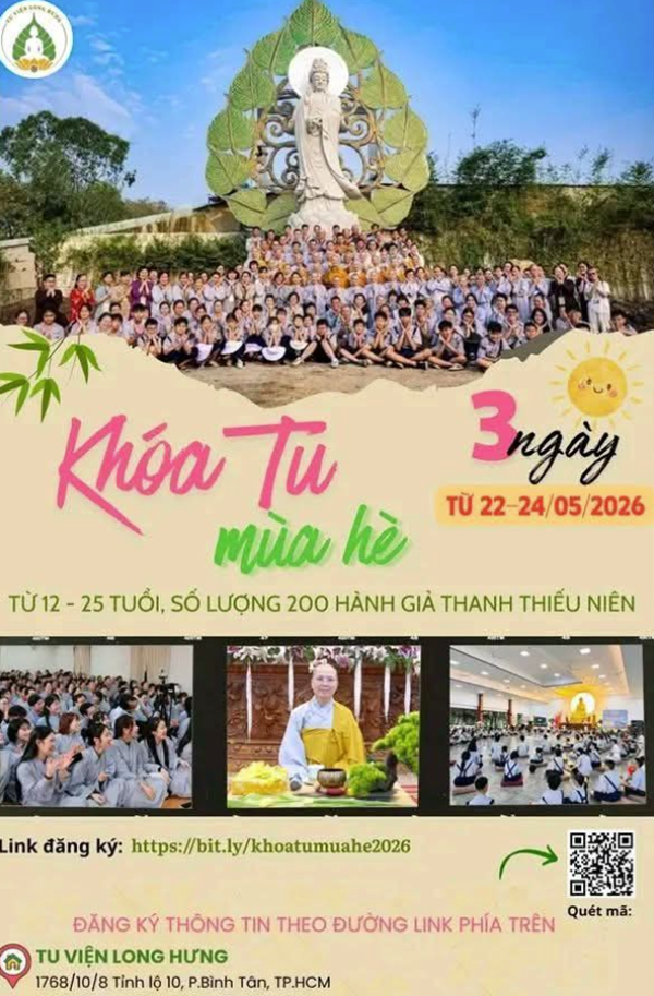 Tu Viện Long Hưng tổ chức Khóa tu mùa hè 2026 – nơi các bạn trẻ có cơ hội trải nghiệm đời sống tu học trong chốn thiền môn, nuôi dưỡng tâm hồn và định hướng cho tương lai.