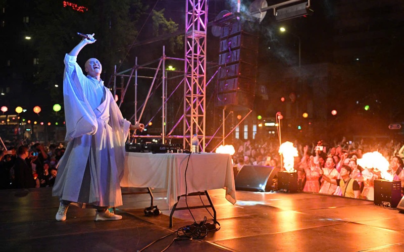 Âm bass dội xuống. Ánh đèn nhấp nháy cắt ngang sân chùa. Khi DJ Soda trong trang phục Hanbok (*) tiếp quản sân khấu, không gian nhanh chóng chuyển sang trạng thái “rave” sôi động, với danh sách nhạc từ “Gangnam Style” của PSY, “Water” của Tyla cho đến cả bản remix EDM từ chính giai điệu tụng Tâm Kinh.