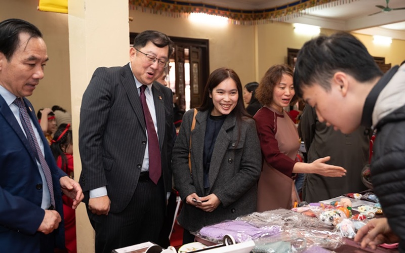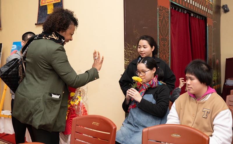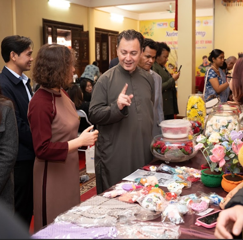 Các vị khách quốc tế vô cùng bất ngờ thú vị khi xem những sản phẩm thủ công được tạo ra từ những bàn tay bé nhỏ của các bé khuyết tật.