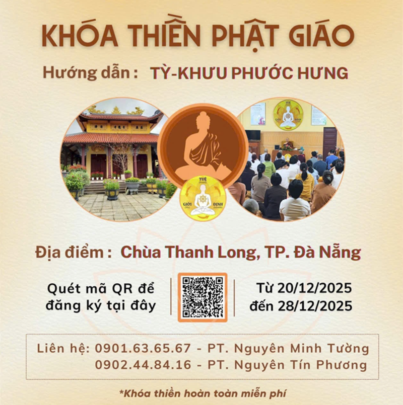 Nhằm tạo duyên lành cho đại chúng cùng dừng lại, lắng nghe thân và tâm, mở rộng không gian của sự tỉnh thức trong từng khoảnh khắc, chùa Thanh Long tổ chức Khóa Thiền hoàn toàn miễn phí. Đây là cơ hội để mỗi người quay về chăm sóc nội tâm, nuôi dưỡng chính niệm, và học cách mỉm cười với chính mình giữa dòng đời chuyển động.