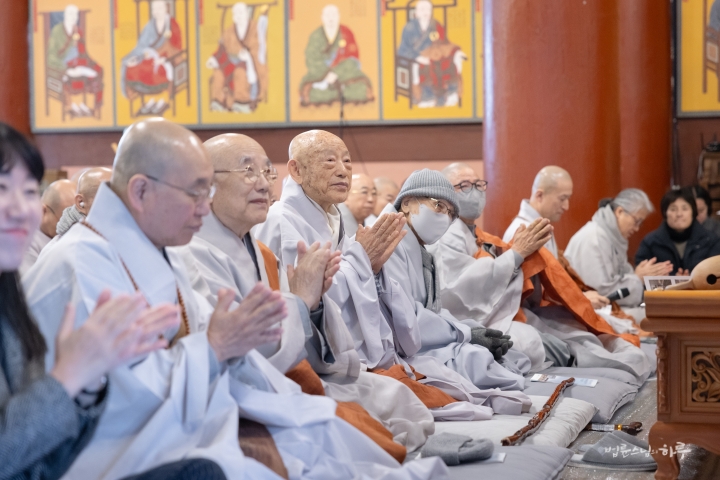 Tôi xin được đề nghị quý vị dành thêm một tràng pháo tay nữa để bày tỏ lòng tri ân sâu sắc đối với Trưởng lão Hòa thượng Bulsim Domun - người đã suốt chín mươi năm cuộc đời kiên trì gìn giữ và tiếp nối chí nguyện của Thiền sư Yongseong, nhờ đó hôm nay chúng ta mới có thể thực hiện được công trình Phật sự đầy ý nghĩa này.