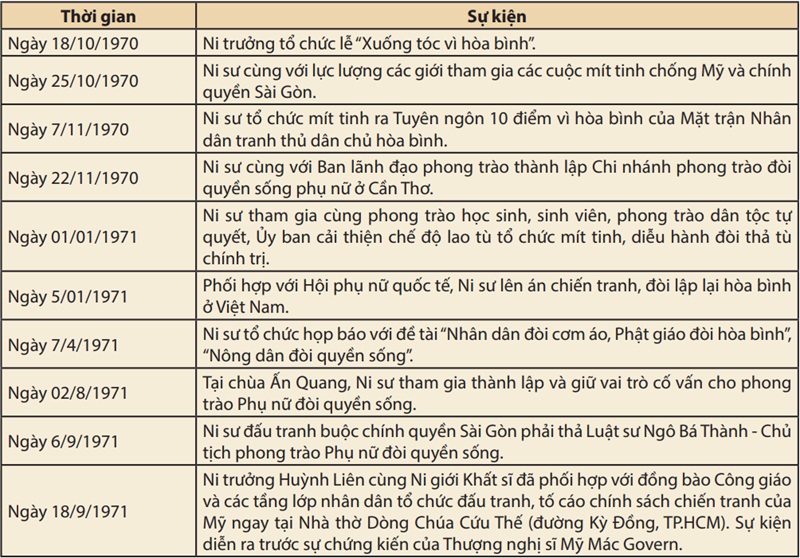 Cuối năm 1971 đến đầu năm 1975, phong trào đấu tranh tiếp tục diễn ra sôi động với mục tiêu rõ rệt là đòi dân quyền, dân sinh, dân chủ, đòi tự do ngôn luận, tự do báo chí, đòi thả tù nhân chính trị; đòi ngụy quyền thực hiện hiệp định Paris, đòi hòa bình, hòa giải hòa hợp dân tộc. Đặc biệt trong hai năm cuối cùng (1973 - 1975) trước ngày đất nước hoàn toàn giải phóng là giai đoạn gay go, gian khổ và khó khăn nhất đối với Ni trưởng. Bằng sự kiên định và sáng suốt, Ni trưởng đã giữ vững tổ chức, củng cố niềm tin và tiếp tục duy trì các hoạt động đấu tranh trong bối cảnh vô cùng khó khăn. Ngày 04/10/1974, Phối hợp với Ủy ban chống tịch thu báo chí tổ chức mít tinh tại chợ Bến Thành để phản đối chính quyền Sài Gòn tịch thu báo và tiến hành “Đọc báo nói cho đồng bào tôi nghe” qua loa đài. Ni sư còn tham gia “Ngày ký giả ăn mày”, mang bị gậy diễu hành quanh chợ Bến Thành rồi đến mít tinh trước Hạ nghị viện vào ngày 10/10/1974.